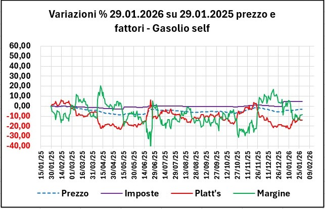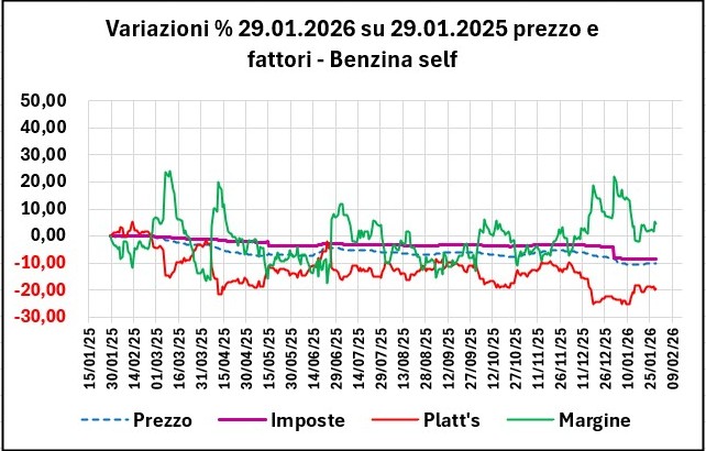 I prezzi del 29/01/2026 sono ancora inferiori alla media del periodo 29/01/2025-29/01/2026 per la benzina per i seguenti valori: benzina self -0,079 €/lt, benzina servito -0,078; ma superiori per il gasolio: self +0,027, servito +0,026, complice la rimodulazione delle accise.