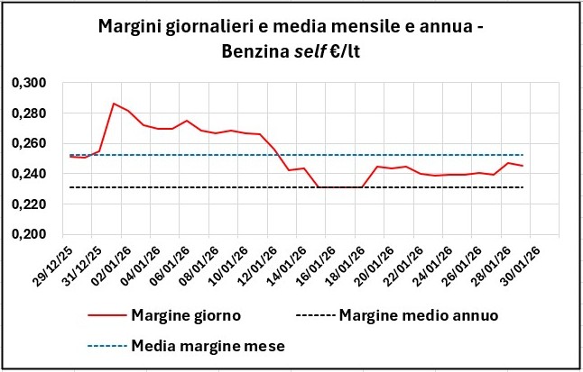 Si segnala che – con riferimento alle dinamiche graduali di adeguamento dei prezzi alle variazioni intervenute sull’ammontare delle accise (-0,049 €/lt con IVA sulla benzina, +0,049 sul gasolio) ed alle variazioni delle quotazioni dei raffinati – al 29/01/2026 i margini industriali lordi della benzina risultano inferiori alla media mensile e superiori alla media annuale, mentre quelli del gasolio sono scesi sotto la media mensile e approssimano quella annua.