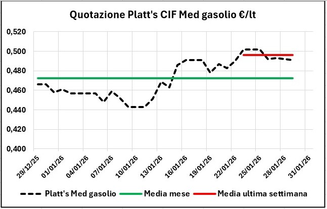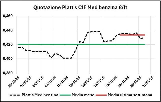 Nell’arco di una settimana, dal 22/01/2026 al 29/01/2026 la quotazione Platt’s CIF Med dei prodotti ha registrato una variazione in decremento di -0,002 €/lt con IVA per la benzina e in incremento di +0,001 per il gasolio, mentre i prezzi sono saliti di +0,004/+0,005 €/lt per la benzina, e per il gasolio di +0,008/+0,009, a seconda delle modalità di vendita.