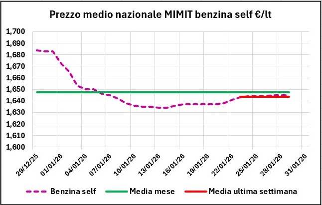 Sulla base del prezzo medio nazionale di tutta la rete, elaborato sul file “Il prezzo alle 8” del MIMIT, si osserva che dal 29/12/2025 al 29/01/2026 il prezzo della benzina in self è diminuito di -0,039 €/lt (da 1,684 a 1,645, -2,32 %) e in servito di -0,040 (da 1,827 a 1,787, -2,19 %); quello del gasolio è cresciuto in self di +0,046 €/lt (da 1,637 a 1,683, +2,81 %) e in servito di +0,045 (da 1,778 a 1,823, +2,53 %).