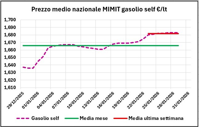 Sulla base del prezzo medio nazionale di tutta la rete, elaborato sul file “Il prezzo alle 8” del MIMIT, si osserva che dal 22/01/2026 al 29/01/2026 il prezzo della benzina è salito in self di +0,004 €/lt (da 1,641 a 1,645, +0,24 %) e in servito di +0,005 (da 1,782 a 1,787, +0,28 %); quello del gasolio è salito in self di +0,008 €/lt (da 1,675 a 1,683, +0,48 %) e di +0,009 in servito (da 1,814 a 1,823, +0,50 %).