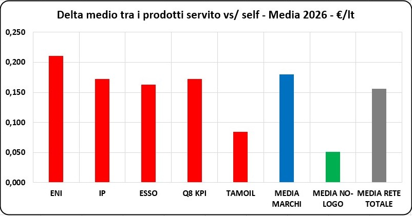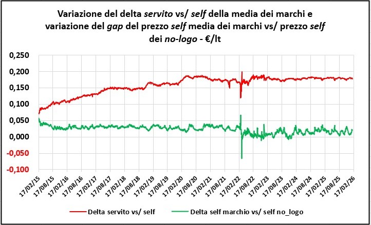 Considerando la somma di tutte le variazioni sul giorno antecedente, sia in aumento che in diminuzione, tra il 17 febbraio 2015 ed il 31 gennaio 2026, il delta prezzo tra servito e self nella media delle reti di marchio è salito di +0,106 euro/litro, il gap del prezzo self delle reti di marchio rispetto al self dei «no-logo» è sceso di -0,036 euro/litro.