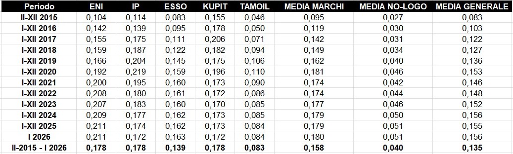 Nell’elaborazione del mese di gennaio sono anche indicate, per l’intero periodo 17.02.2015-31.01.2026, le variazioni del delta prezzo in «self» dei diversi marchi e del complesso della rete «colorata» rispetto al prezzo in «self» dei no-logo, indicando le correlazioni tra incremento del delta prezzo tra le due modalità e variazione della performance di competitività verso i no-logo, con l’esposizione del rapporto tra le due grandezze [ossia di quante volte è aumentato il delta prezzo tra «self» e «servito» dei singoli marchi rispetto al recupero di competitività rispetto al «self» dei no-logo]. Tra l’inizio del periodo di studio [media febbraio 2015] e la fine [media gennaio 2026] il delta prezzo tra servito e self è aumentato di +0,106 euro/litro, ossia 2,780 volte quanto è diminuito il gap competitivo del prezzo self di marchio rispetto al prezzo self della media dei «no-logo» (-0,038 euro/litro).
