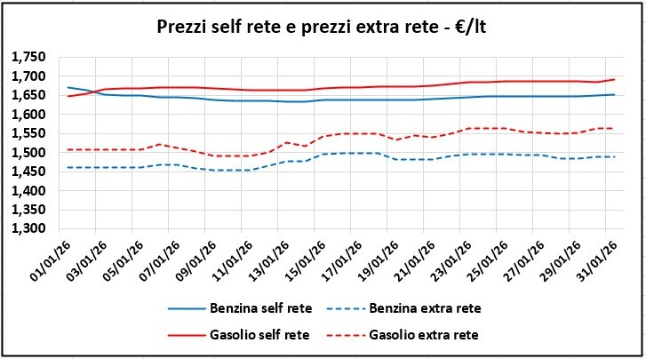 Le differenze riscontrate tra i prezzi in modalità self della rete «colorata» ed i prezzi di extra rete per la media nazionale del mese di gennaio 2026 sono per la benzina di circa 16,6 cent/litro e per il gasolio di circa 14,2 cent/litro.