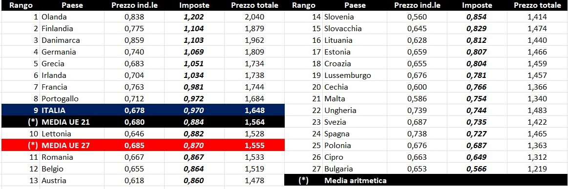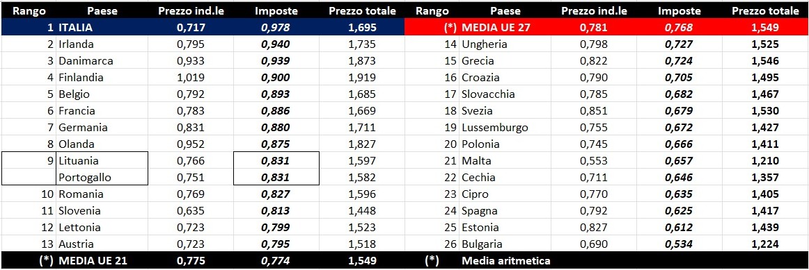 Per quanto attiene la rilevanza delle imposte sui carburanti, l’Italia si colloca al 16.02.2026 al nono per il prodotto benzina, con 0,970 euro/litro su totali 1,648 di prezzo al pubblico (contro la media di 0,870 a 27 Paesi e di 0,884 a 21 Paesi area euro), nonché al primo per il gasolio con 0,978 euro/litro su 1,695 di prezzo al consumo (contro la media di 0,768 a 27 Paesi e di 0,774 a 21 Paesi area euro).