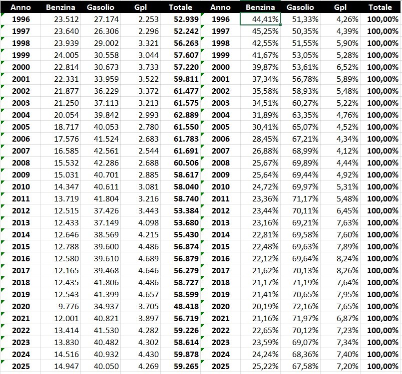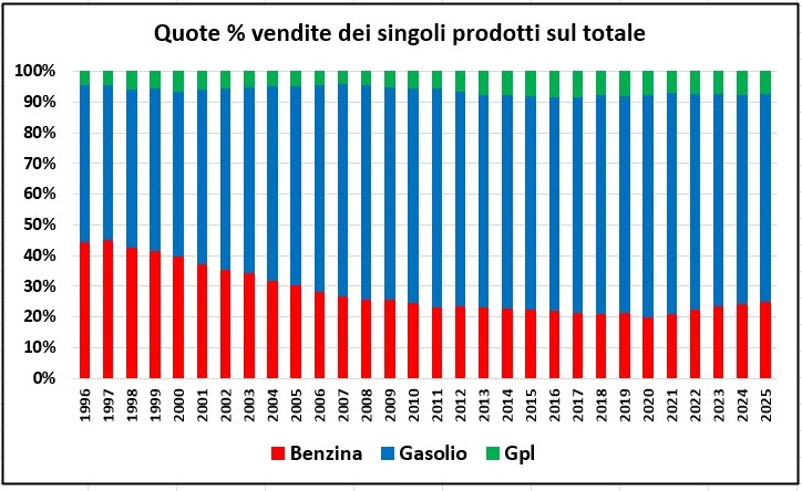 MIX DELLE VENDITE DEI PRODOTTI (BENZINA, GASOLIO E GPL) 1996-2025