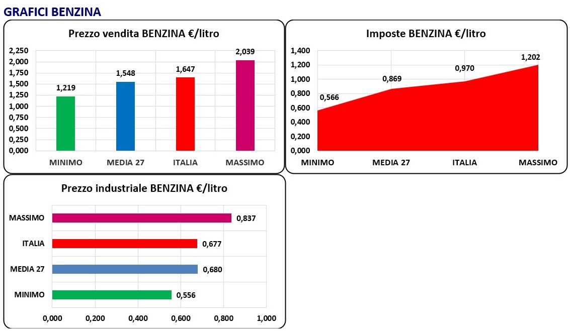 Per il prezzo della benzina, l’Italia si colloca al nono posto in una classifica decrescente (dal più alto al più basso) con 1,647 €/lt contro un massimo di 2,039 per l’Olanda, un minimo di 1,219 per la Bulgaria e una media aritmetica di 1,548 per i 27 Paesi EU; per le imposte l’Italia si colloca all’ottavo posto (assieme al Portogallo) in una classifica decrescente (dal più alto al più basso) con 0,970 €/lt contro un massimo di 1,202 per l’Olanda, un minimo di 0,566 per la Bulgaria e una media aritmetica di 0,869 per i 27 Paesi EU; per il prezzo industriale (prezzo meno imposte) l’Italia si colloca all’undicesimo posto in una classifica decrescente (dal più alto al più basso) con 0,677 €/lt contro un massimo di 0,837 per l’Olanda, un minimo di 0,556 per la Slovenia e una media aritmetica di 0,680 per i 27 Paesi EU.