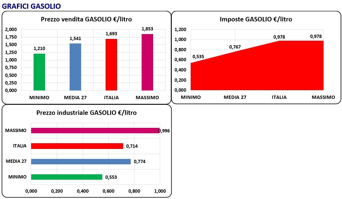 Per il prezzo del gasolio, l’Italia si colloca al sesto posto in una classifica decrescente (dal più alto al più basso) con 1,693 €/lt contro un massimo di 1,853 per la Finlandia, un minimo di 1,210 per Malta e una media aritmetica di 1,541 per i 27 Paesi EU; per le imposte l’Italia si colloca al primo posto in una classifica decrescente (dal più alto al più basso) con 978 €/lt, quindi al massimo, contro un minimo di 0,535 per la Bulgaria e una media aritmetica di 0,767 per i 27 Paesi EU; per il prezzo industriale (prezzo meno imposte) l’Italia si colloca al ventiduesimo posto in una classifica decrescente (dal più alto al più basso) con 0,714 €/lt contro un massimo di 0,966 per la Finlandia, un minimo di 0,553 per Malta e una media aritmetica di 0,774 per i 27 Paesi EU.