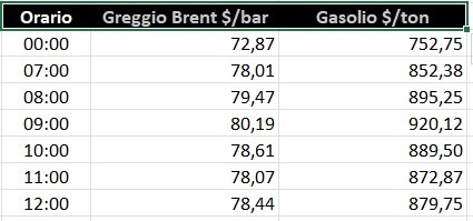 Parallelamente, le quotazioni del gasolio di Londra sono schizzate da 752,75 $/tonnellata a 879,75 (ore 12:00), dopo un picco di 920,12 alle ore 09:00, con un aumento, pertanto, pari a +16,9 punti percentuali (+22,2 % al picco).