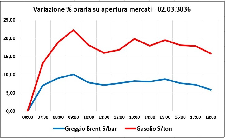 Parallelamente, le quotazioni del gasolio di Londra sono schizzate da 752,75 $/tonnellata a 872,12 (ore 18:00), dopo un picco di 920,12 alle ore 09:00, con un aumento, pertanto, pari a +15,9 punti percentuali (+22,2 % al picco).