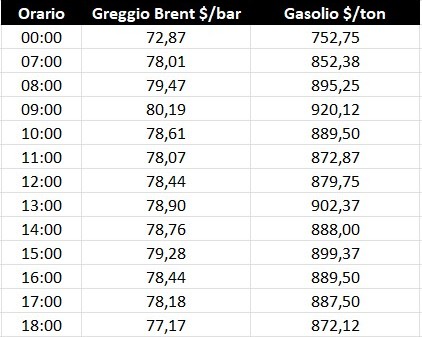 In poche ore – che abbiamo continuiamo a monitorare ora per ora dalle 07:00 alle 18:00 e di cui daremo aggiornamenti nei giorni venturi -, le quotazioni del greggio Brent sono balzate da 72,87 a 77,17 (ore 18:00) $barile, dopo avere toccato alle 09:00 un picco di 80,19, con una escursione di +5,9 punti percentuali (+10,1 al picco).