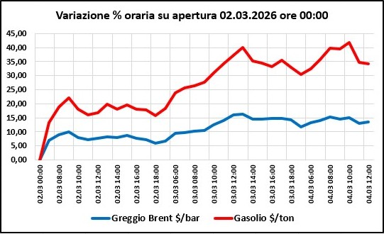 Parallelamente, le quotazioni del gasolio di Londra sono schizzate da 752,75 $/tonnellata a 1.010,87 (ore 12:00 di oggi), con un aumento, pertanto, pari a +258,12 $/tonnellata e +34,29 punti percentuali (con un picco alle 10:00 di oggi di 1.067,12).