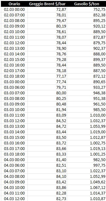 Nel giro di circa sessanta ore, durante le quali abbiamo monitorato l’andamento delle quotazioni del greggio Brent e del raffinato gasolio – dalle ore 00:00 del 2 marzo e fino alle ore 12:00 del 4 marzo -, le quotazioni del greggio Brent sono balzate da 72,87 a 82,73 (ore 12:00 di oggi) $barile, con una escursione di +9,86 $/barile e +13,53 punti percentuali (con un picco alle 13:00 di ieri di 84,72).
