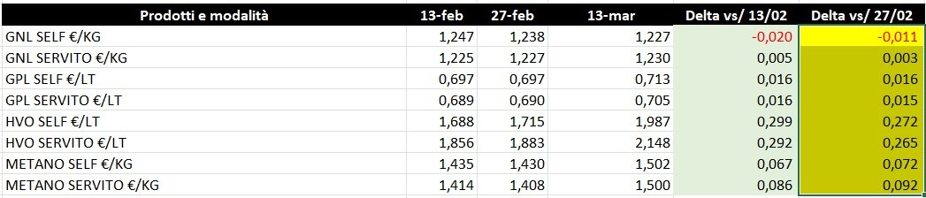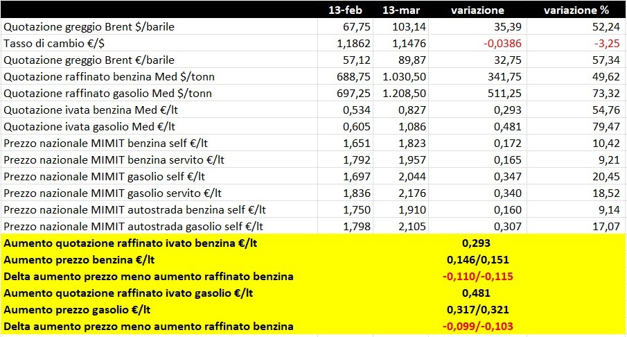 Nello stesso intervallo di tempo, dal 27.02 al 13.03, i prezzi alla pompa (media Italia nazionale sulla base dei prezzi comunicati al MIMIT, file pubblico “il prezzo alle 8”) sono aumentati come segue: prezzo MIMIT medio benzina self, da 1,672 a 1,823 €/lt, +9,03 % e +0,151 €/lt, medio benzina servito, da 1,811 a 1,957 €/lt, +8,06 % e +0,146 €/lt; prezzo MIMIT medio gasolio self, da 1,723 a 2,044 €/lt, +18,63 % e +0,321 €/lt, medio gasolio servito, da 1,859 a 2,176 €/lt, +17,05 % e +0,317 €/lt.