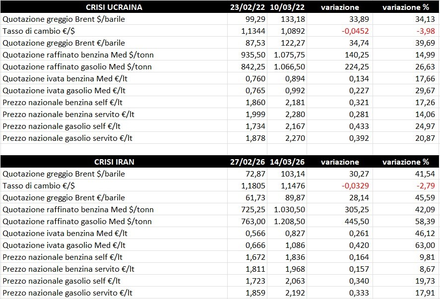 Dal 27.02 al 14.03.2026 (Iran) le quotazioni dei raffinati sono cresciute di un +42,9 % e di +305,25 $/tonnellata per la benzina, di un +58,4 % e di +445,50 $/tonnellata per il gasolio; espresse in €/lt con IVA il raffinato benzina è salito di un +46,1 % e di +0,261 €/lt, il raffinato gasolio di un +63,0 % e di +0,420 €/lt; escursioni, in termini percentuali ed assoluti, superiori per la benzina e inferiori per il gasolio rispetto alla fase Ucraina.