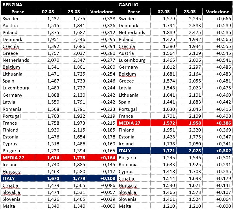 Per gli aumenti intervenuti dal 02.03 (rilevazione ante scoppio della guerra in Iran) al 23.03 (ultima rilevazione della Commissione Europea), per la benzina l’Italia si colloca al 22° posto (dall’alto in basso) con un incremento di +0,108 €/lt, tra un massimo di +0,338 (Svezia) ed un minimo di 0,000 (Malta, il cui prezzo é fisso da anni), con una media di +0,164; per il gasolio al 19° posto, con un aumento di +0,302 €/lt, tra un massimo di +0,666 (Svezia) e il solito minimo di 0,000 di Malta, con una media comunitaria di +0,386.