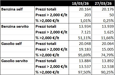 Nello stesso intervallo di tempo, dal 27.02 al 27.03, i prezzi alla pompa (media Italia nazionale sulla base dei prezzi comunicati al MIMIT, file pubblico “il prezzo alle 8”) sono variati come segue E SOLO IN CONSEGUENZA DELLA RIDUZIONE DI ACCISA di cui al DL 33/2026 del 18.03: prezzo MIMIT medio benzina self, da 1,672 a 1,745 €/lt, +4,37 % e +0,073 €/lt, medio benzina servito, da 1,811 a 1,882 €/lt, 3,92 % e +0,071 €/lt; prezzo MIMIT medio gasolio self, da 1,723 a 2,044 €/lt, +18,63 % e +0,321 €/lt, medio gasolio servito, da 1,859 a 2,178 €/lt, +17,16 % e +0,319 €/lt.