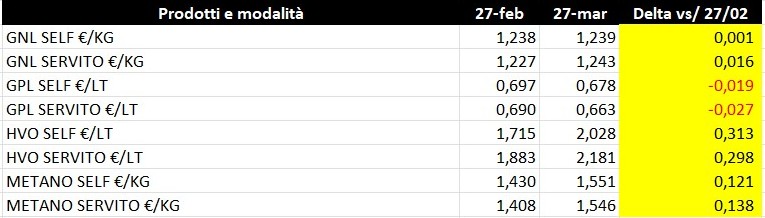 Per i prezzi degli altri prodotti, la tabella seguente evidenzia, in somma sintesi, un limitato effetto della riduzione di accisa (da 0,147 a 0,092 €/lt) del GPL, la sostanziale coerenza delle variazioni tra HVO e gasolio, gli aumenti del metano (in correlazione con gli aumenti del gas naturale), mentre il GNL registra limitatissime variazioni in lieve o lievissimo aumento.
