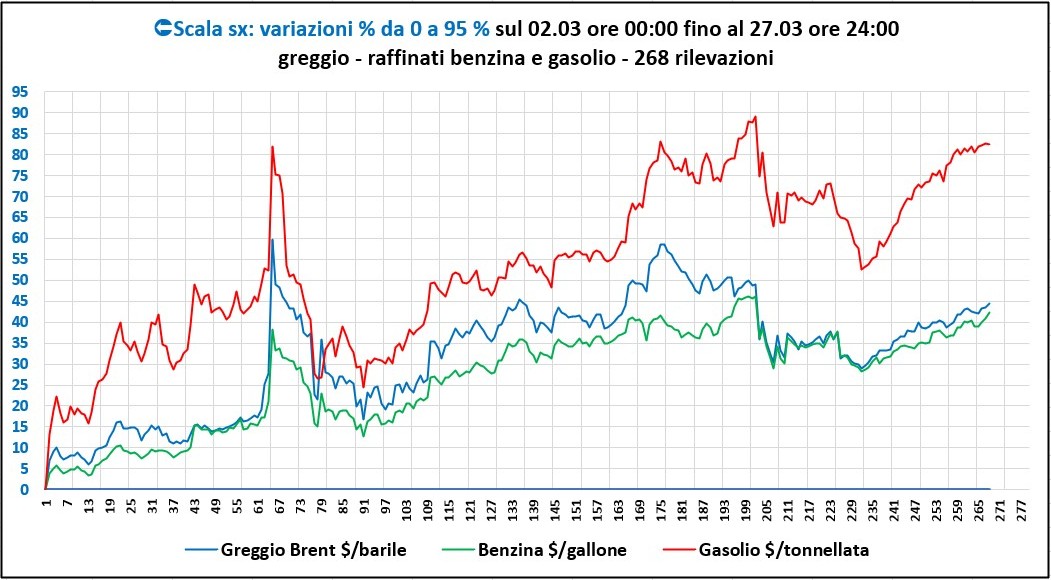 La tavola ed il grafico seguente, condotto sulla base di 268 rilevazioni a intervalli orari dalle ore 00:00 del 2 marzo alle ore 24:00 del 27 marzo, delle quotazioni internazionali future di greggio e raffinati, mettono in evidenza l’ampiezza delle escursioni del mercato che hanno caratterizzato il periodo successivo all’apertura dei mercati dopo il week end dell’inizio della guerra e fino a questo fine settimana: il greggio Brent in $/barile è aumentato di un +44,53 %, il raffinato benzina in $/gallone di un +42,21 % e infine il gasolio in $/tonnellata di un +82,46 % (fonte: Investing).