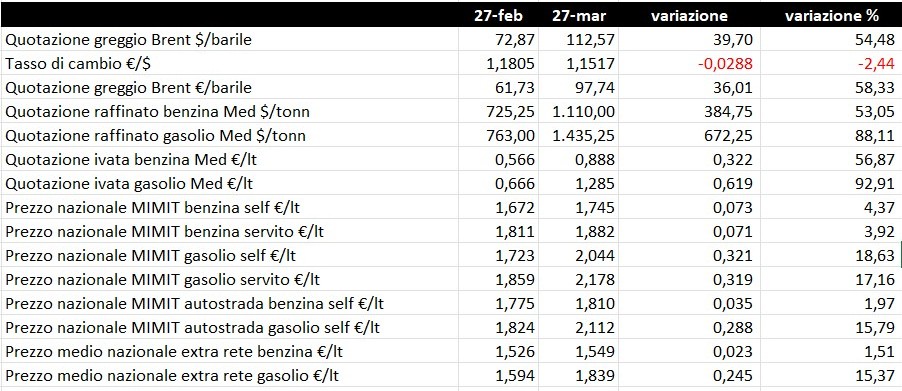Dal 27.02 al 27.03 (i dati, pertanto, coincidono con un intero mese di osservazione), la quotazione (fonte Bloomberg) del greggio Brent in $/barile è salita da 72,87 a 112,57 $, ossia di +39,70 $ e di un +54,48 %, mentre la quotazione in €/barile ha preso +36,01 € (da 61,73 a 97,74 €, +58,33 %), complice anche un marcato deprezzamento del tasso di cambio €/$ (da 1,1805 a 1,1517, -2,44 %).