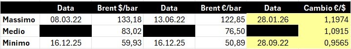 Dovendosi rifare ai fondamentali di mercato internazionali, nello stesso periodo che va dal 1° gennaio 2022 al 28 marzo 2026, si possono osservare i livelli massimi, medi e minimi delle quotazioni del greggio Brent in dollari ed euro/barile, nonché del tasso di cambio €/$, e le date in cui sono stati raggiunti i picchi superiori e inferiori: come si evidenzia nella tavola seguente 1) le quotazioni massime si sono osservate tra il marzo e il giugno 2022, 2) le quotazioni attuali sono inferiori a quelle massime allora registrate.