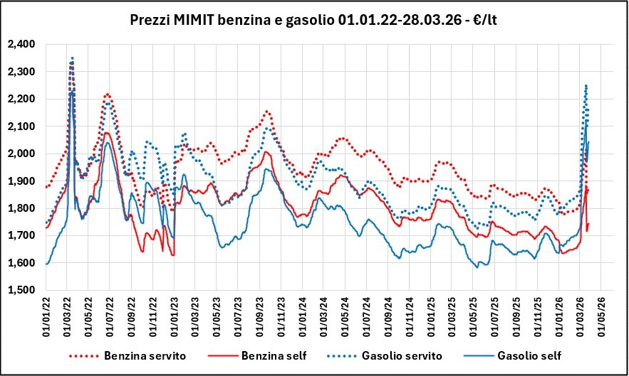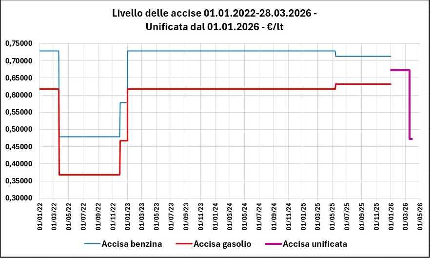 Per completezza, si evidenzia altresì la dinamica delle accise nel periodo 01.01.2022 – 28.03.2026, in cui spiccano le due maggiori riduzioni (marzo 2022 e marzo 2026), i graduali ripristini di novembre 2022 e gennaio 2023, nonché il riallineamento intervenuto a maggio 2025 tra accisa della benzina ed accisa del gasolio, sfociato dal 01.01.2026 nell’unificazione del valore dell’accisa per ambedue i prodotti.