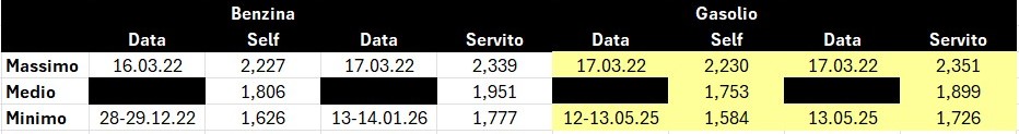 Rifacendosi ai dati di un periodo che va dal 1° gennaio 2022 al 28 marzo 2026, si possono osservare i livelli massimi, medi e minimi dei prezzi di benzina e gasolio self e servito e le date in cui sono stati raggiunti i picchi superiori e inferiori: come si evidenzia nella tavola seguente 1) tutti i prezzi massimi si sono osservati nel marzo 2022, prima del taglio delle accise del Governo Draghi (-0.305 €/lt con IVA), 2) i prezzi attuali sono inferiori a quelli massimi allora registrati e, aspetto non banale, lo erano ancora prima del taglio delle accise del Governo Meloni (-0,244 €/lt con IVA).