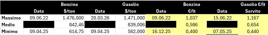 Ancora con riguardo ai fondamentali di mercato internazionali, nello stesso periodo che va dal 1° gennaio 2022 al 28 marzo 2026, si possono osservare i livelli massimi, medi e minimi delle quotazioni dei raffinati benzina e gasolio sulla piazza Mediterraneo in dollari/tonnellata ed euro/litro, e le date in cui sono stati raggiunti i picchi superiori e inferiori: come si evidenzia nella tavola seguente 1) le quotazioni massime si sono osservate tra il marzo e il giugno 2022, 2) le quotazioni attuali sono inferiori a quelle massime allora registrate con la sola eccezione della quotazione in $/tonnellata del gasolio, che ha raggiunto il picco di 1.471,00 il 20.03.2026.