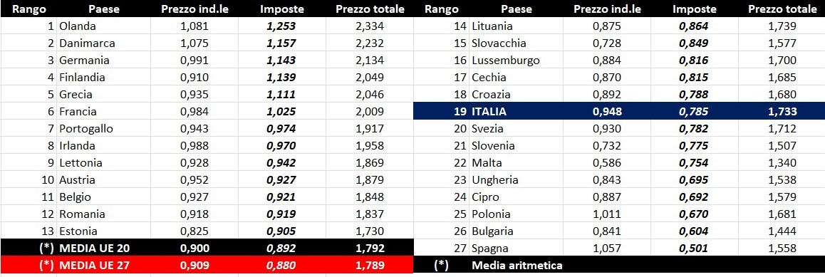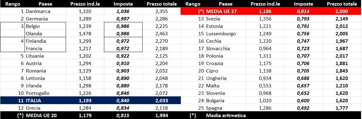 Per quanto attiene la rilevanza delle imposte sui carburanti, l’Italia si colloca al 30.03.2026 al diciannovesimo posto per il prodotto benzina, con 0,785 euro/litro su totali 1,733 di prezzo al pubblico (contro la media di 0,880 a 27 Paesi e di 0,892 a 20 Paesi area euro), nonché all’undicesimo per il gasolio con 0,840 euro/litro su 2,033 di prezzo al consumo (contro la media di 0,814 a 27 Paesi e di 0,815 a 20 Paesi area euro).