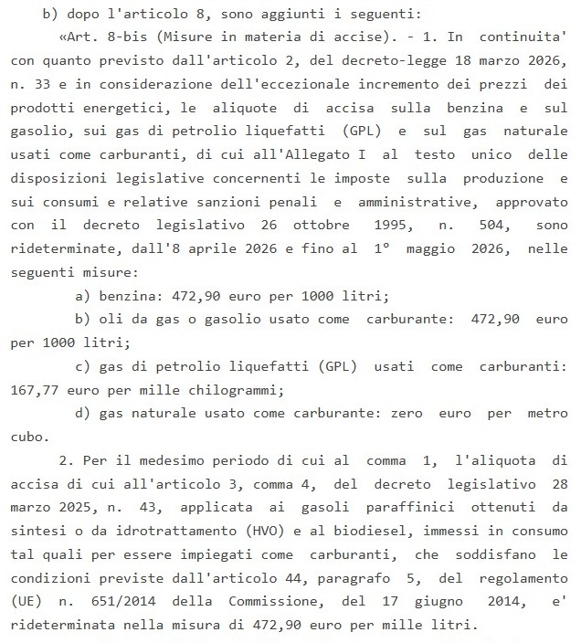 La proroga della riduzione d’accisa già decretata con il DL 33/2026 del 18 marzo è stata pubblicata sulla G.U. n. 78 del 03.04.2026 in cui è contenuto il DL 42/2026 del 3 aprile 2026. Detta proroga opera dall’8 aprile al 1° maggio 2026.