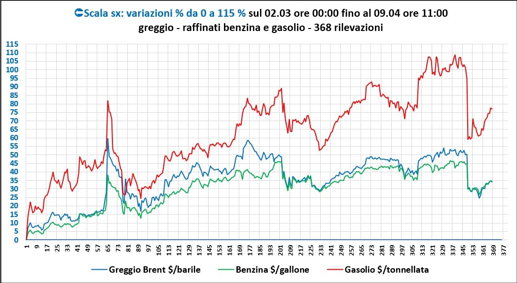 Lo dimostra il grafico seguente, che evidenzia le dinamiche che si sono nuovamente innestate oggi sulle quotazioni future di greggio, benzina e gasolio, ossia in ripresa: