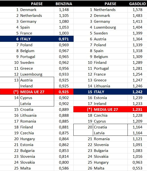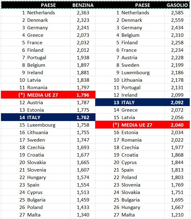 Il prezzo alla pompa della benzina in Italia si colloca (dal più alto al più basso) al 14° posto, con 1,762 €/lt, contro una media comunitaria di 1,796, un massimo di 2,363 (Olanda) e un minimo di 1,340 (Malta); il prezzo del gasolio si pone al 13° posto, con 2,092 €/lt, contro una media di 2,040, un massimo di 2,585 (Olanda) e un minimo di 1,210 (sempre Malta).