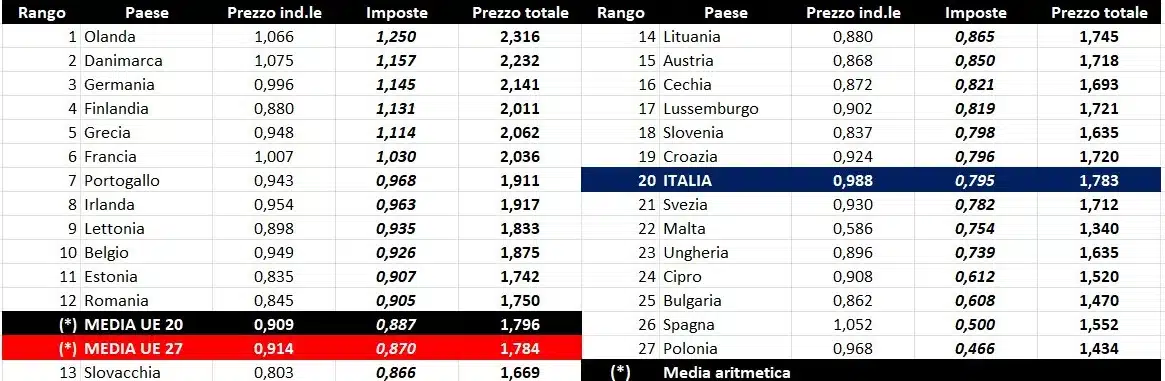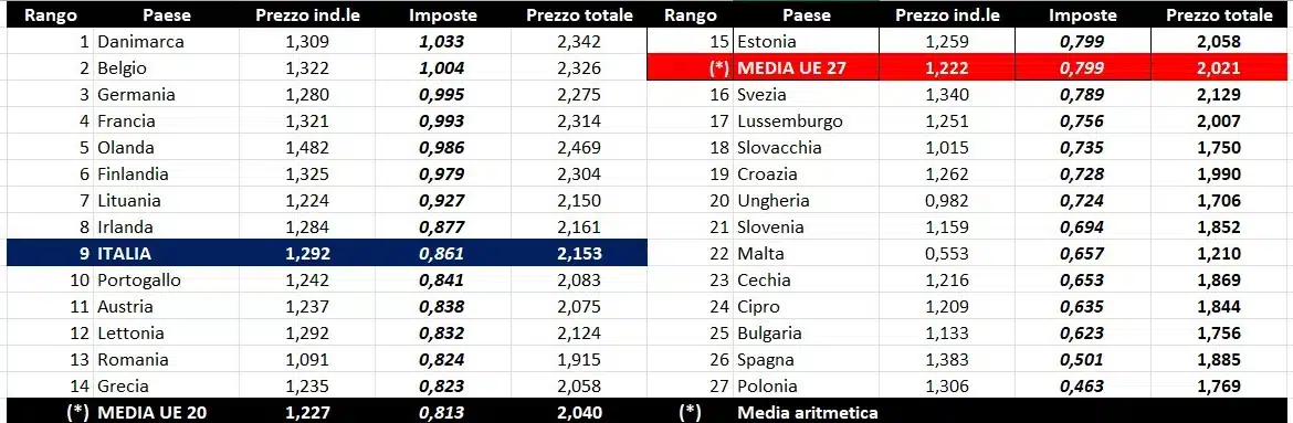 Nel confronto con i prezzi comunitari del 13.04.2026 con la benzina a 1,783 euro/litro, l’Italia si colloca in undicesima posizione, preceduta, in ordine di grandezza decrescente, da Olanda, Danimarca, Germania, Grecia, Francia, Finlandia, Irlanda, Portogallo, Belgio e Lettonia, con media aritmetica dei 27 Paesi pari a 1,784 euro/litro e media aritmetica dei Paesi di Eurozona a 1,796 euro/litro; con il gasolio a euro/litro 2,153, l’Italia si colloca in ottava posizione, preceduta da Olanda, Danimarca, Belgio, Francia, Finlandia, Germania e Irlanda, con una media aritmetica dei 27 Paesi uguale a euro/litro 2,021 e media aritmetica per i Paesi di Eurozona uguale a 2,040 euro/litro.