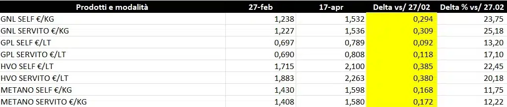 • gli aumenti del metano (tra +0,168 e +0,172 €/kg) e del GNL (tra +0,294 e +0,309 €/kg), in correlazione con gli aumenti del gas naturale).