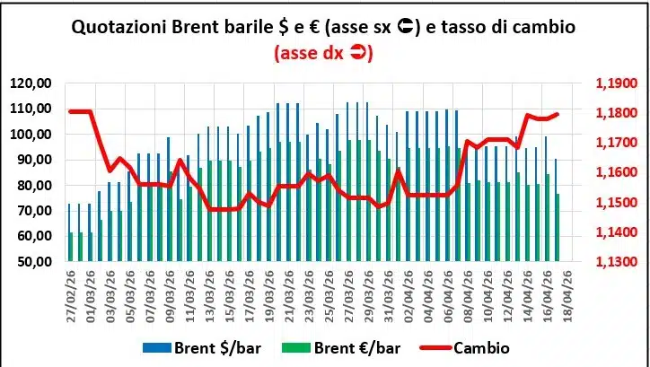 Dal 18.03 al 17.04, la quotazione (fonte Bloomberg) del greggio Brent in $/barile è scesa da 107,38 a 90,38 $, ossia di -17,00 $ e di un -15,83 %, mentre la quotazione in €/barile ha perso -16,76 € (da 93,37 a 76,61 €, -17,95 %), con un apprezzamento del tasso di cambio €/$ (da 1,1500 a 1,1797, +2,58 %).