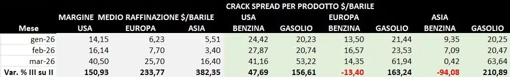 - il margine medio di raffinazione tra tutti i prodotti ($/barile) è cresciuto a marzo rispetto a febbraio di un +150,93 % in USA, di un +233,77 % in Europa e di un +382,35 % in Asia;