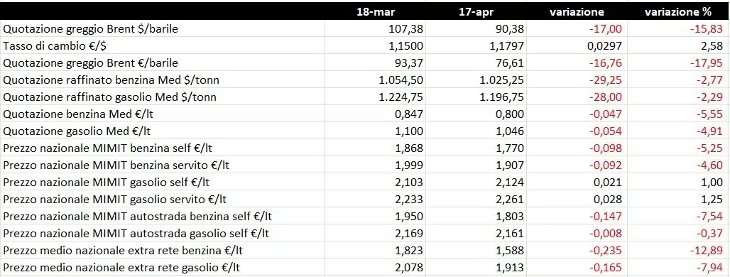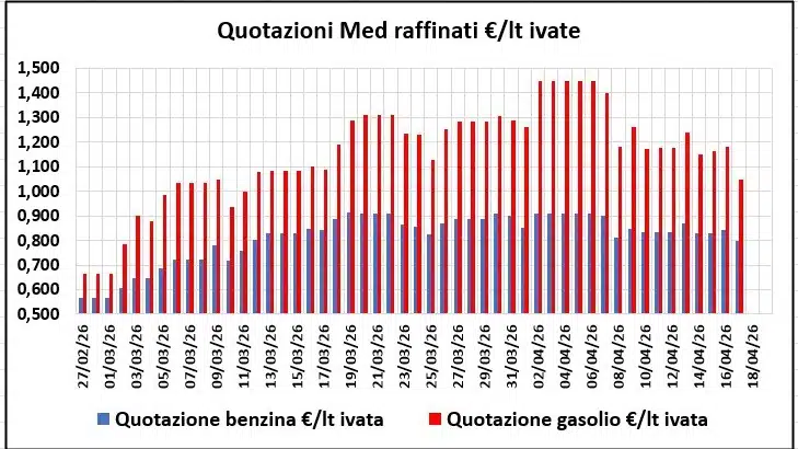 Le quotazioni internazionali dei raffinati in area Mediterraneo da 18.03 al 17.04 sono diminuite di -0,158 €/lt per la benzina e sono diminuite di -0,054 €/lt per il gasolio, per questo ultimo prodotto solo per la diminuzione del 17 aprile, con effetti sui prezzi finali a partire da martedì 21 aprile.