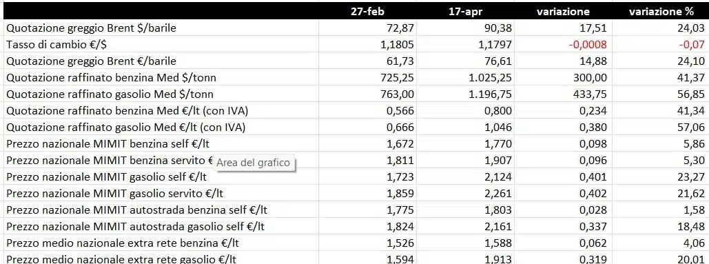 Dal 27.02 al 10.04, la quotazione (fonte Bloomberg) del greggio Brent in $/barile è salita da 72,87 a 90,38 $, ossia di +17,51 $ e di un +24,03 %, mentre la quotazione in €/barile ha preso +14,88 € (da 61,73 a 76,61 €, +24,10 %), con una stabilità del tasso di cambio €/$ (da 1,1805 a 1,1797, -0,07 %).