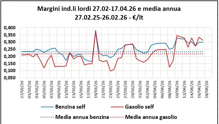 Il margine industriale lordo [=prezzo finale meno imposte + quotazione raffinato)] dallo scoppio della guerra (27.02.2026-17.04.2026) segnala una media del periodo sulla benzina di 0,249 €/lt, sul gasolio di 0,210, che risulta in parte diversa dalla media del margine industriale lordo dell’anno 27.02.2025-26.02.2026, che vale invece 0,233 €/lt per la benzina e 0,217 per il gasolio, ossia più bassa per la benzina e più alta per il gasolio. Se si fa la media dei due prodotti in base al mix dei consumi (40 % benzina e 60 % gasolio), si osserva che nel periodo dallo scoppio della guerra il margine è leggermente maggiore di quello registrato come media nell’anno precedente: 0,226 €/lt contro 0,223.