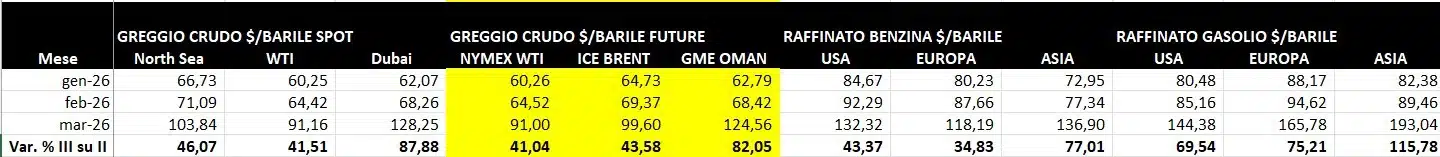 - analoghe dinamiche si osservano per le quotazioni future (anche in questo caso in $/barile) dei greggi: +43,58 % il Brent ICE di Londra, +41,04 % il WTI al Nymex NYC e, in disallineamento, +82,05 % per il GME Oman;