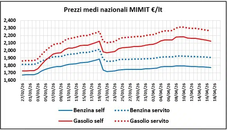 Nello stesso intervallo di tempo, dal 27.02 al 17.04, i prezzi alla pompa (media Italia nazionale sulla base dei prezzi comunicati al MIMIT, file pubblico “il prezzo alle 8”) sono variati come segue IN CONSEGUENZA DELLA RIDUZIONE DI ACCISA di cui al DL 33/2026 del 18.03 e al DL 42/2026: prezzo MIMIT medio benzina self, da 1,868 a 1,770 €/lt, -5,25 % e -0,098 €/lt, medio benzina servito, da 1,999 a 1,907 €/lt, -4,60 % e -0,092 €/lt; prezzo MIMIT medio gasolio self, da 2,103 a 2,124 €/lt, +1,00 % e +0,021 €/lt, medio gasolio servito, da 2,233 a 2,261 €/lt, +1,25 % e +0,028 €/lt.