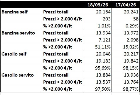 Tralasciando la statistica sulla benzina self (quote irrisorie, 0,29 %), per la benzina servito i valori superiori ai 2 euro sono scesi dal 51,11 % del totale del giorno 18.03 al 15,02 % del giorno 17.04, per il gasolio self sono saliti dal 95,69 % al 98,15 % % e infine per il gasolio servito sono saliti dal 97,50 % al 98,77 %.