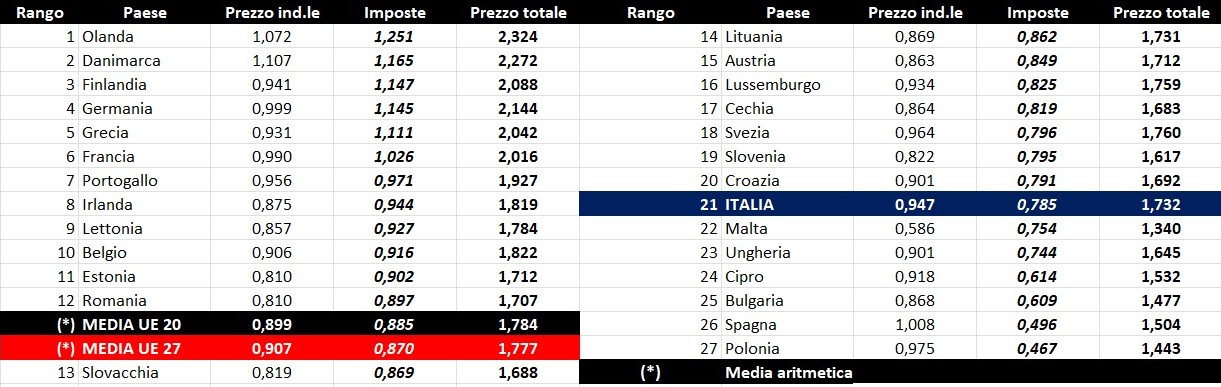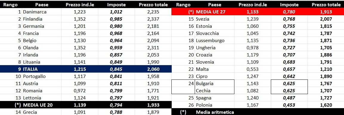 Per quanto attiene la rilevanza delle imposte sui carburanti, l’Italia si colloca al 27.04.2026 al ventunesimo posto per il prodotto benzina, con 0,785 euro/litro su totali 1,732 di prezzo al pubblico (contro la media di 0,870 a 27 Paesi e di 0,885 a 20 Paesi area euro), nonché al nono per il gasolio con 0,845 euro/litro su 2,060 di prezzo al consumo (contro la media di 0,780 a 27 Paesi e di 0,794 a 20 Paesi area euro).